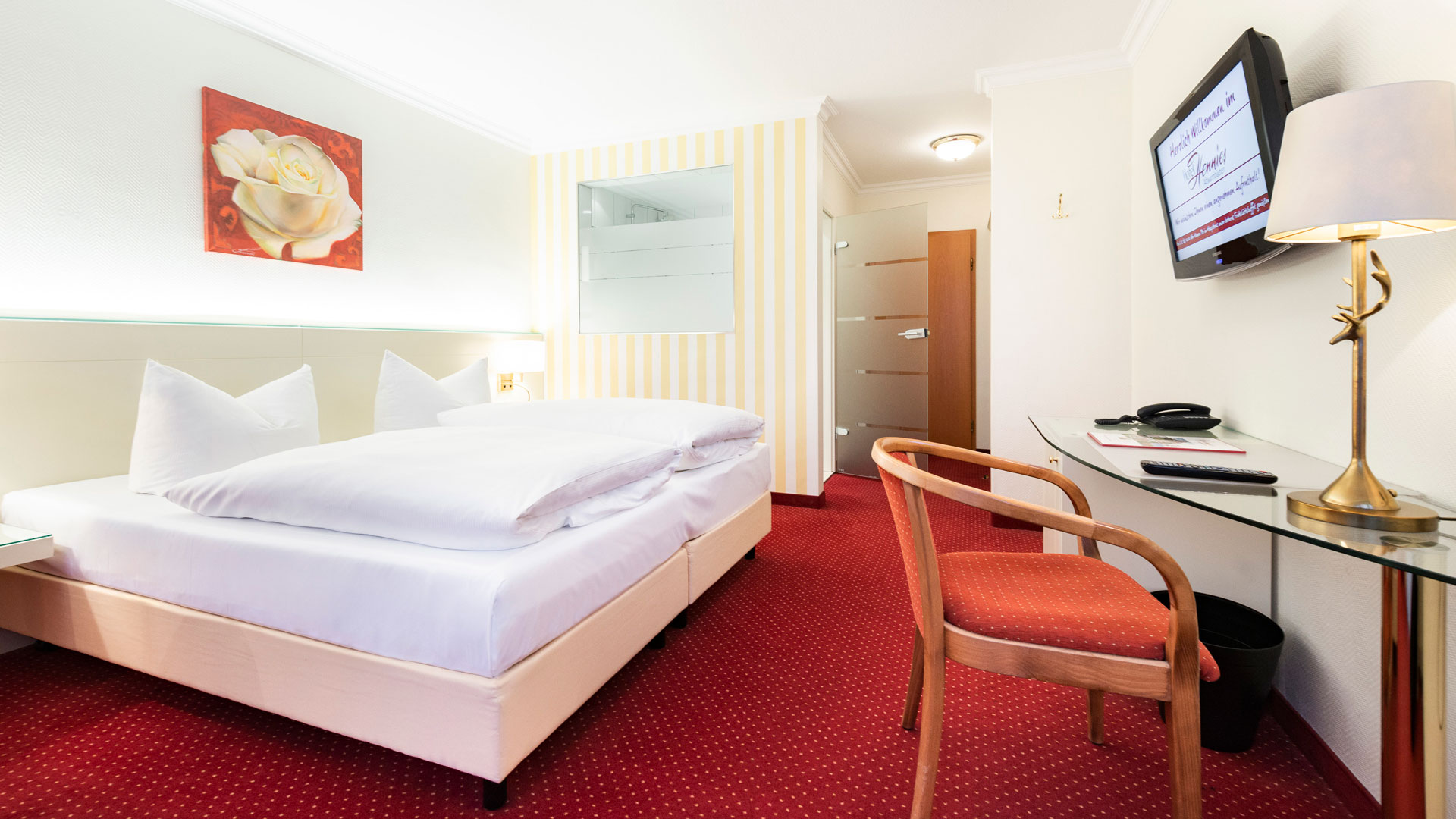 Die Gästezimmer bieten neben komfortablem Bett, Schreibtisch, Flat-TV, Bad mit Dusche und WC auch kostenfreies Highspeed-WLAN.